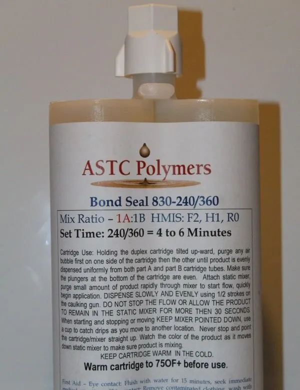 830 is dispensed from a duplex cartridge or plural component pump. Available in non-pigmented white color (call for special order in black color), in dual cartridges kits (21 oz or 600 ml total product in one cartridge kit – requires dual cartridge dispensing gun), 2 and 10 gallon kits (equal part A/B). Special order 100 gallon kits available. Also available in 3 different set times depending on the project and temperature. Set times are temperature dependent, warm conditions speed set times and cool conditions slow set times. Select accordingly. For example the 45/60 seconds is best for cool or cold conditions. Can be applied down to -20F