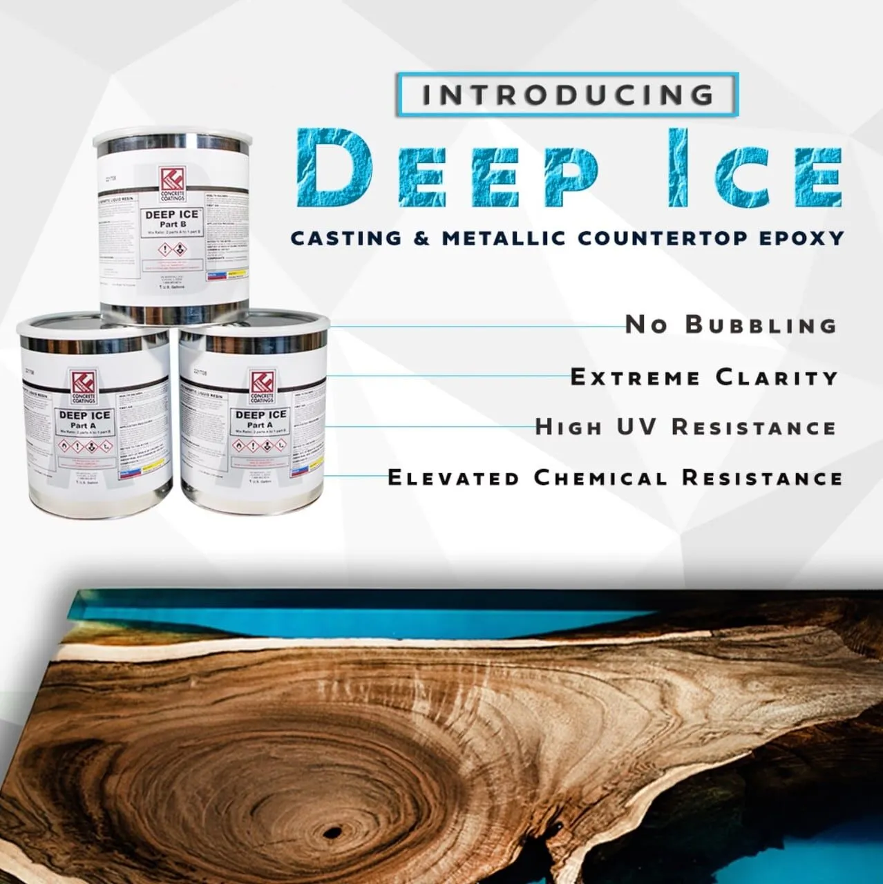 Deep Ice is a 100% solids, professional grade hybrid epoxy resin used for casting projects, metallic counters, and embedding objects. This extremely clear resin can be poured up to 4 inches thick at one time, is very UV resistant and has phenomenal structural strength, chemical resistance, and is bubble free.