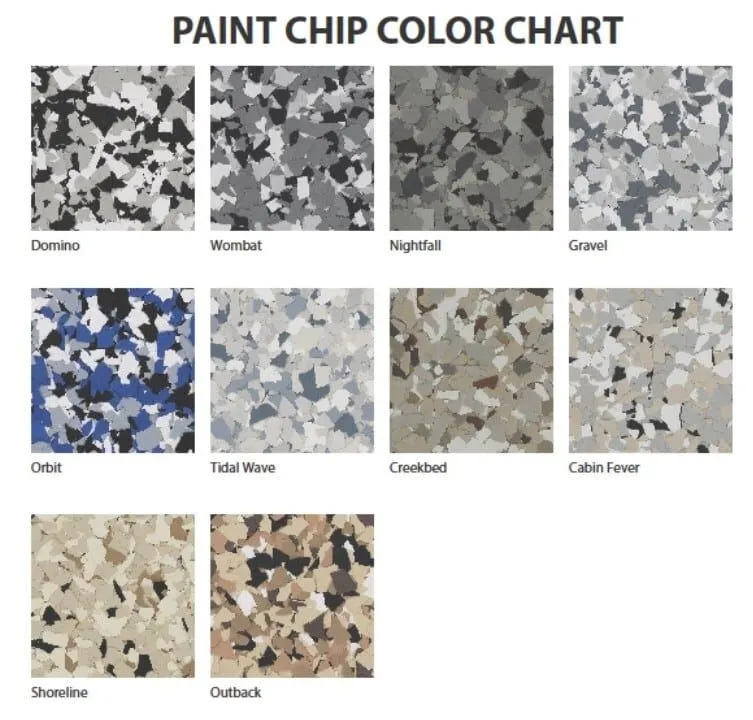 Our 1/4″ color vinyl color chips are designed to enhance the look of of seamless epoxy, polyurea, polyaspartic and urethane resin-based flooring systems. Sold by the lb (min order 11 lbs) allow for use on small projects without waste buying larger quantities. They can be used on commercial, residential and industrial floor projects. Choose from 10 blended color 1/4″ vinyl chip colors to create a great decorative look or create your own custom blend. The chart for each of the 12 color blends below shows the percentage of each of the individual colors that make up that blend.