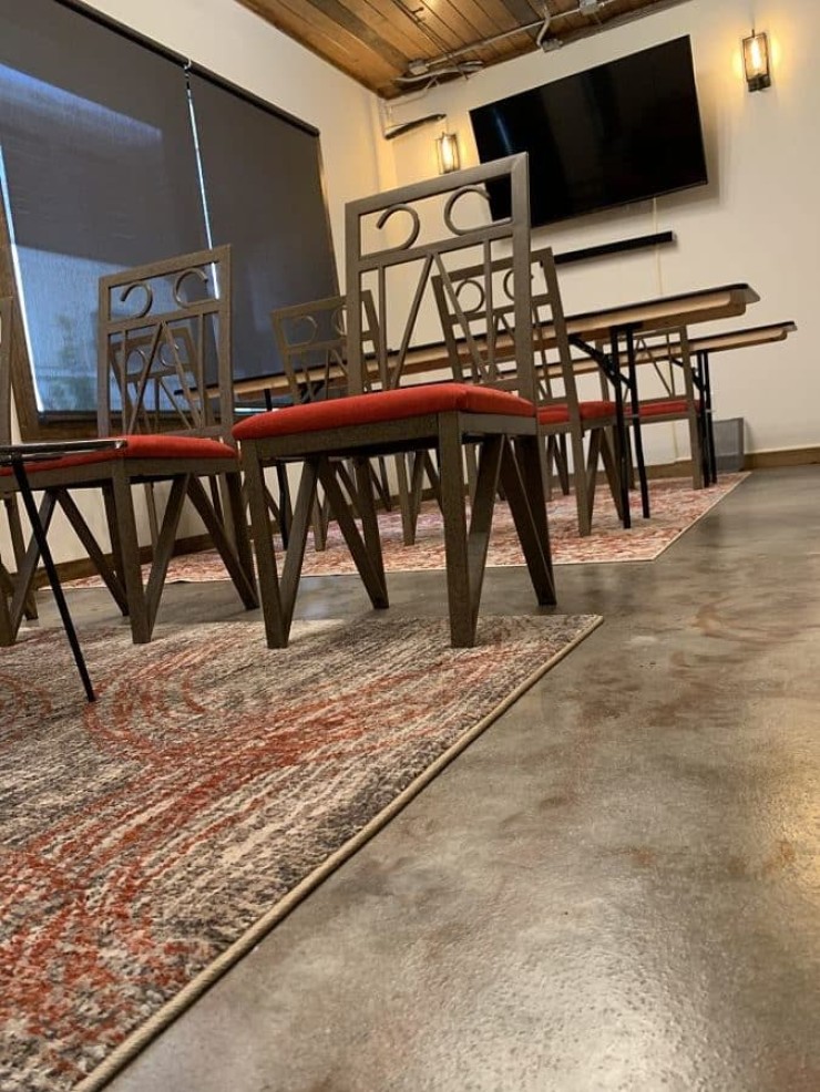 Most metallic systems use a solid color primer but by using a clear epoxy with no color, the natural look of the concrete was accented using two metallic pigment colors.